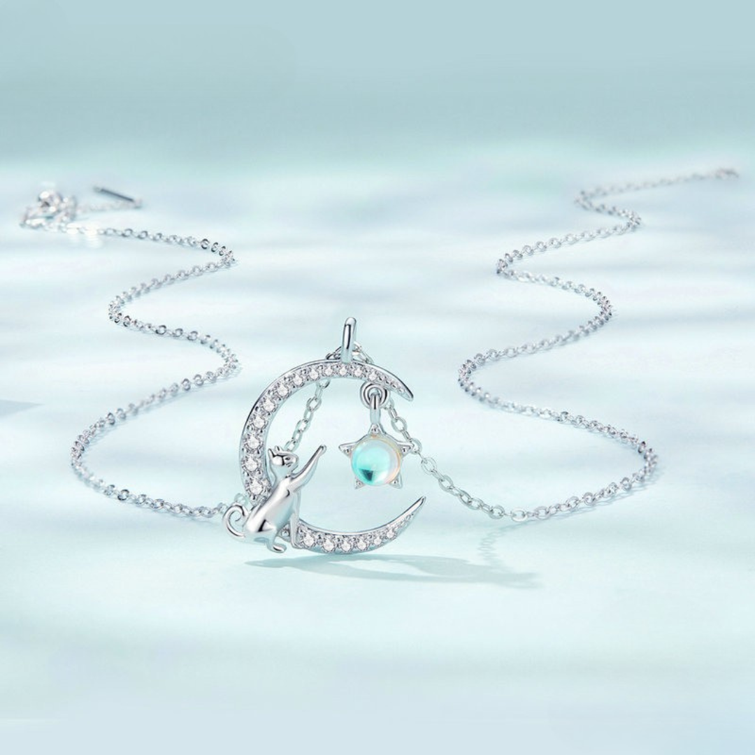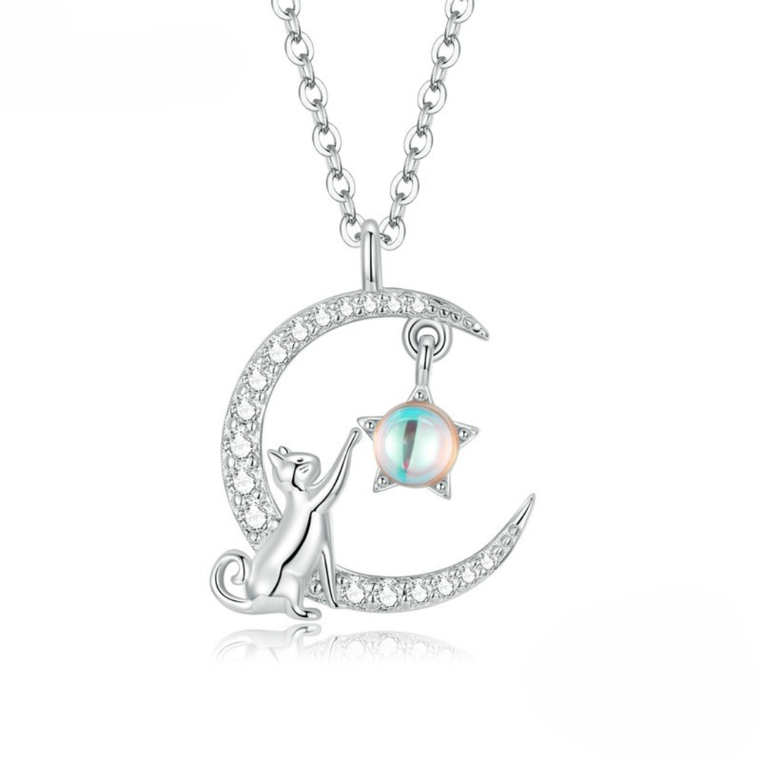 🔹 Colar Gato e Lua Prata 925 – Encanto Celestial com Pedra Moonstone