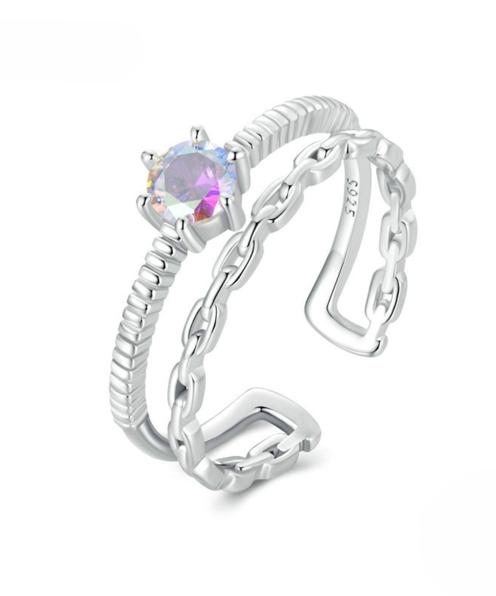 🔹 Anel Aura Prata 925 – Brilho Iridescente em Corrente Dupla