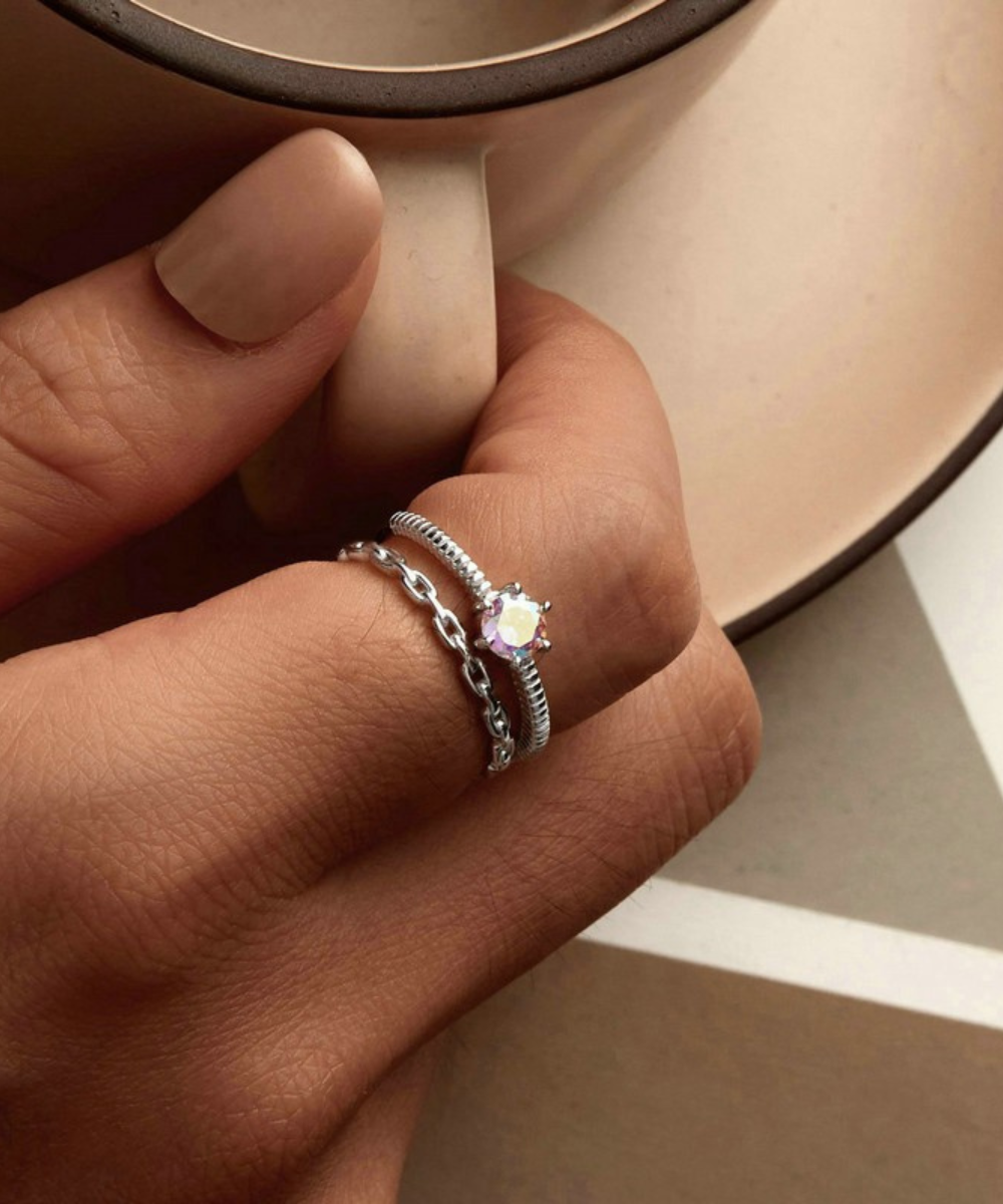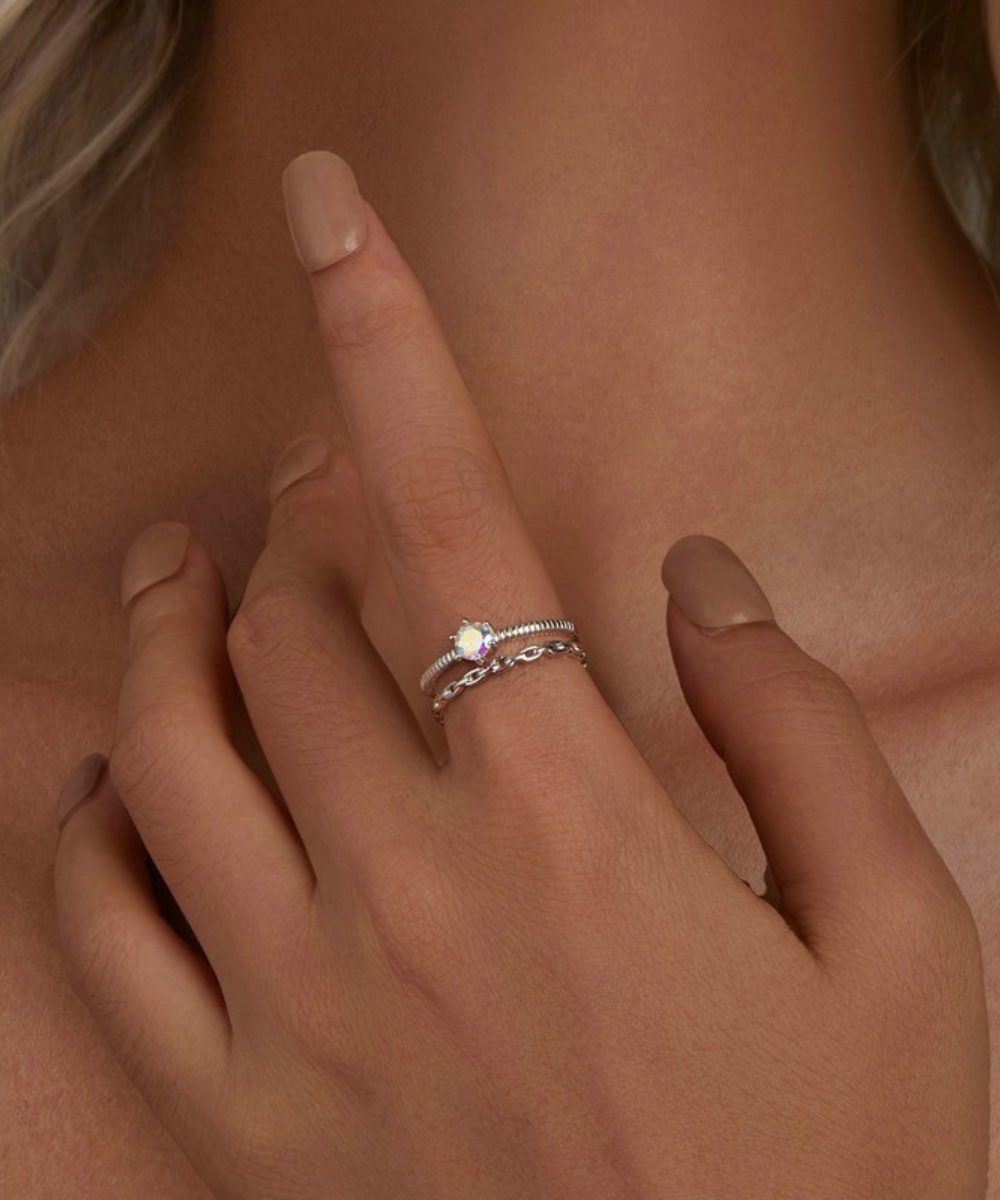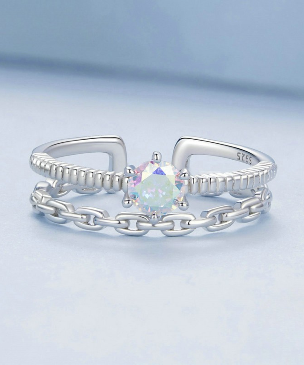 Um anel moderno, cheio de personalidade e com um toque único de sofisticação. O design em duas camadas combina a delicadeza da corrente com a elegância da pedra iridescente central, que reflete diferentes tons conforme a luz — criando um efeito prismático deslumbrante.