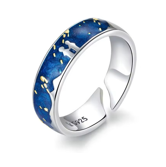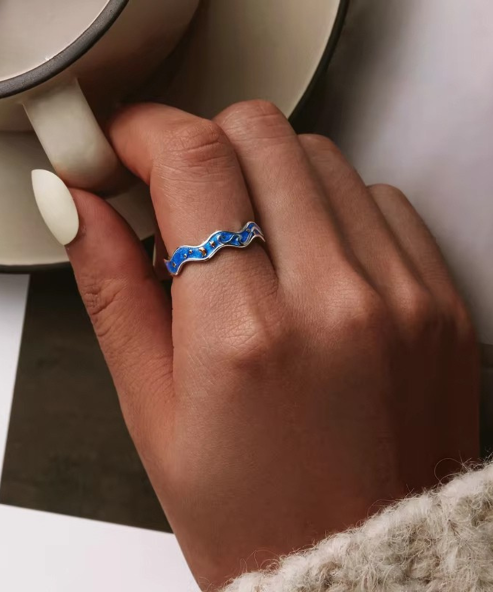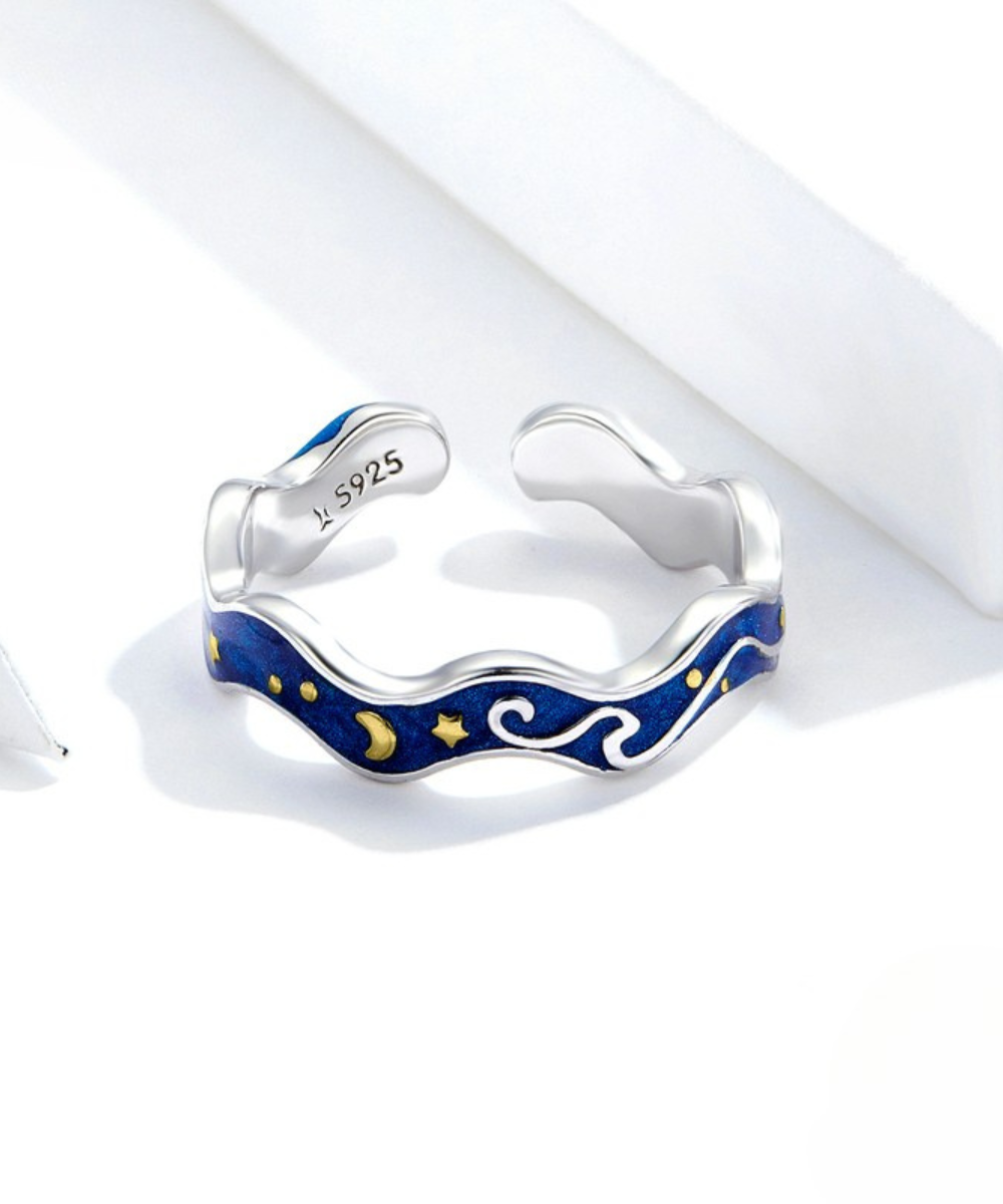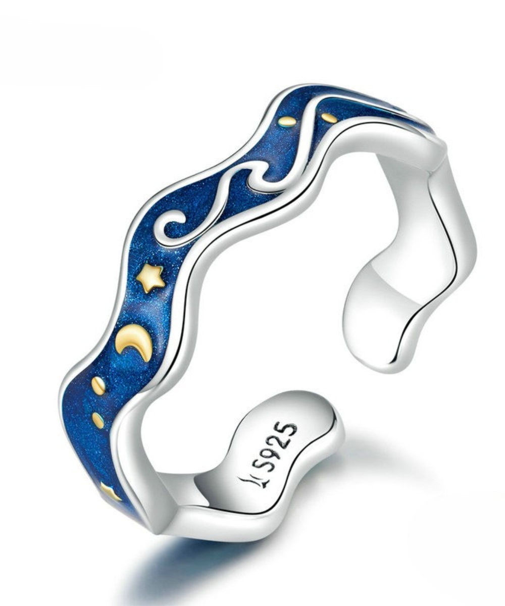 Com um design que homenageia a famosa obra “Noite Estrelada” de Van Gogh, este anel combina arte e romantismo em uma joia única. O azul profundo com detalhes de luas e estrelas representa sonhos, conexão e eternidade.