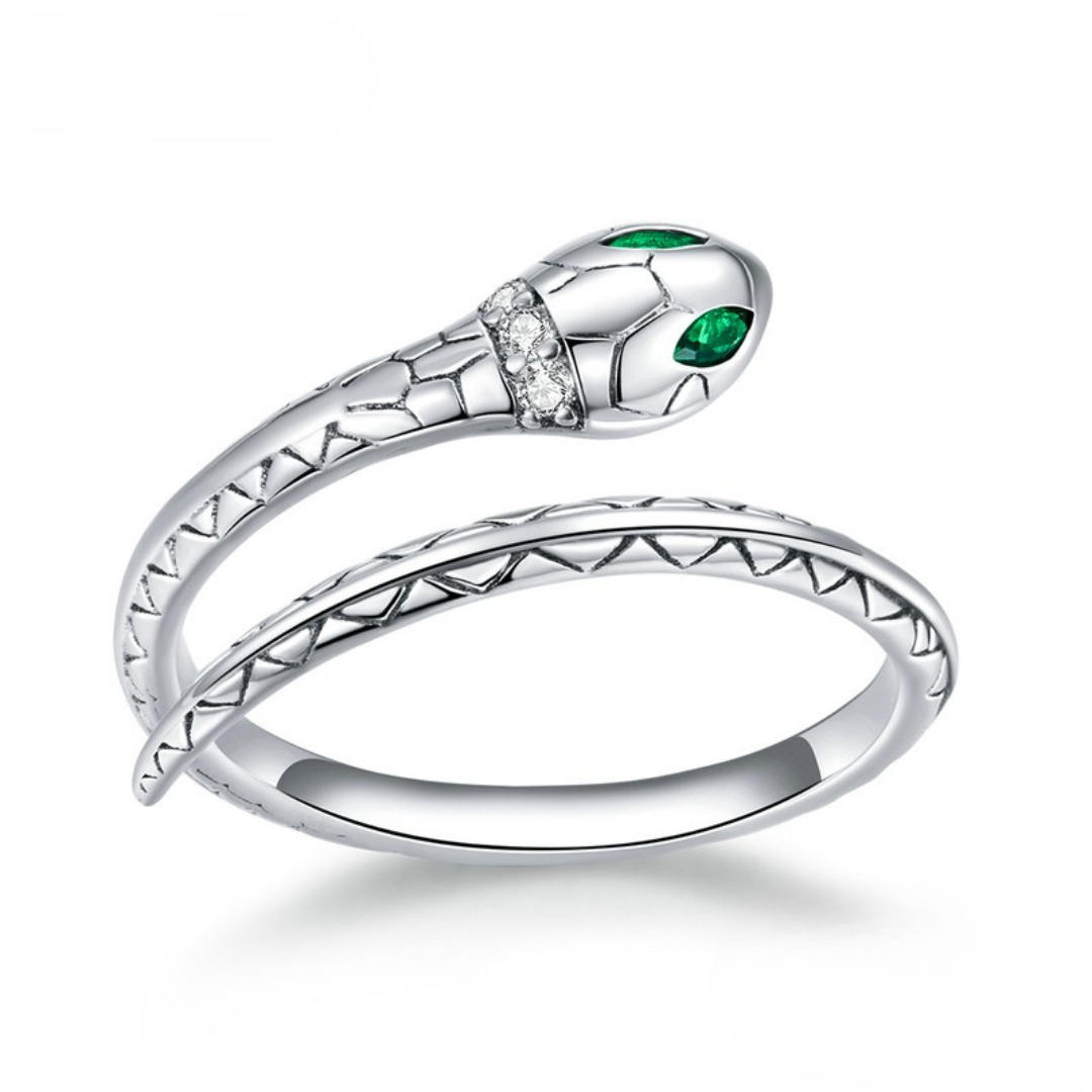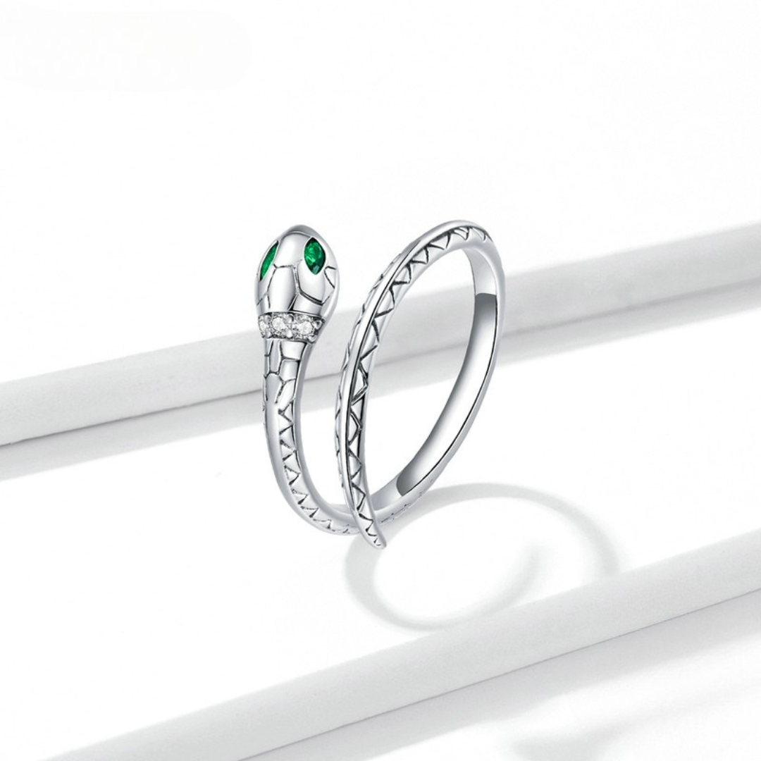 Anel ajustável em Prata 925 legítima com design vintage em formato de cobra, olhos em zircônia verde e detalhes texturizados que trazem um toque místico e elegante.