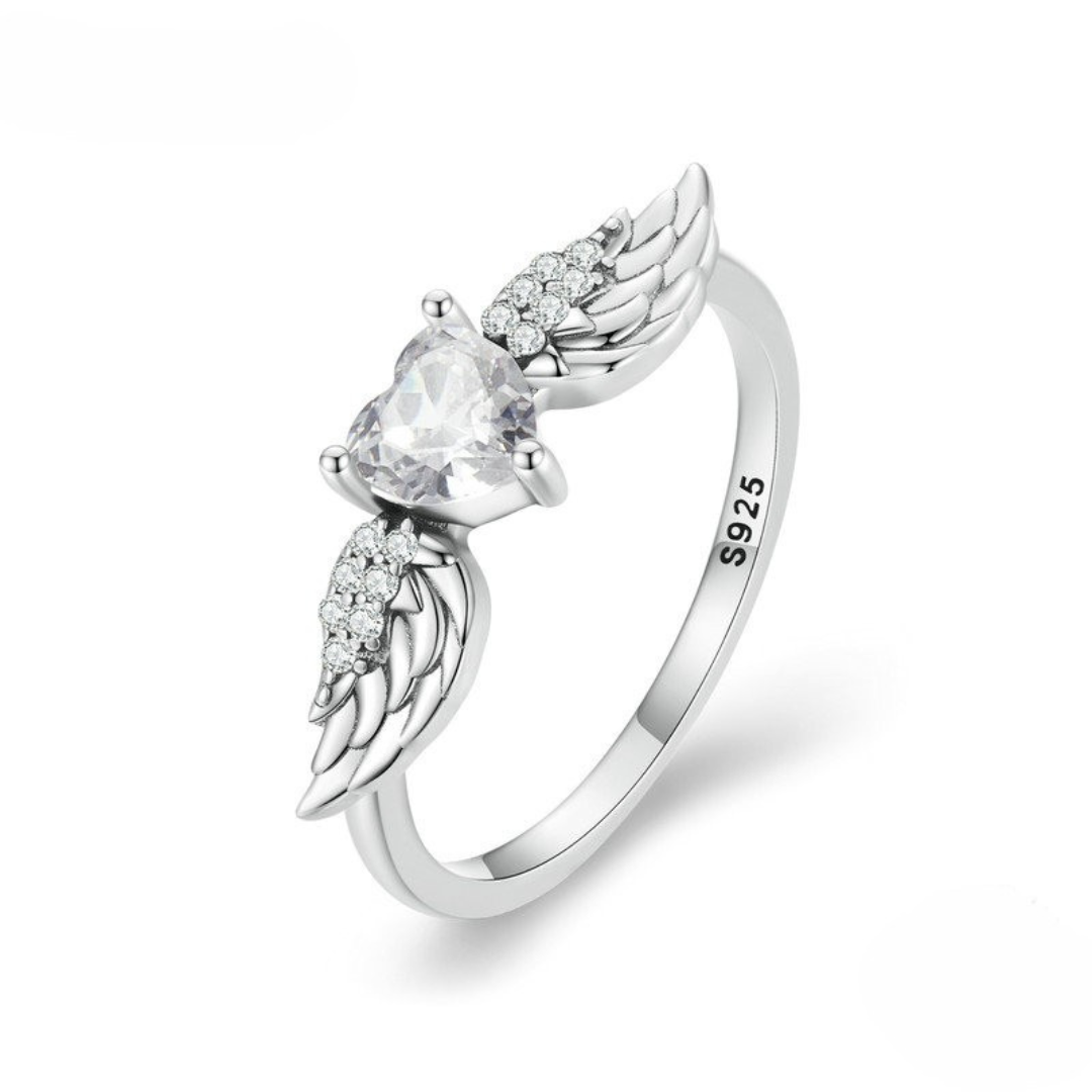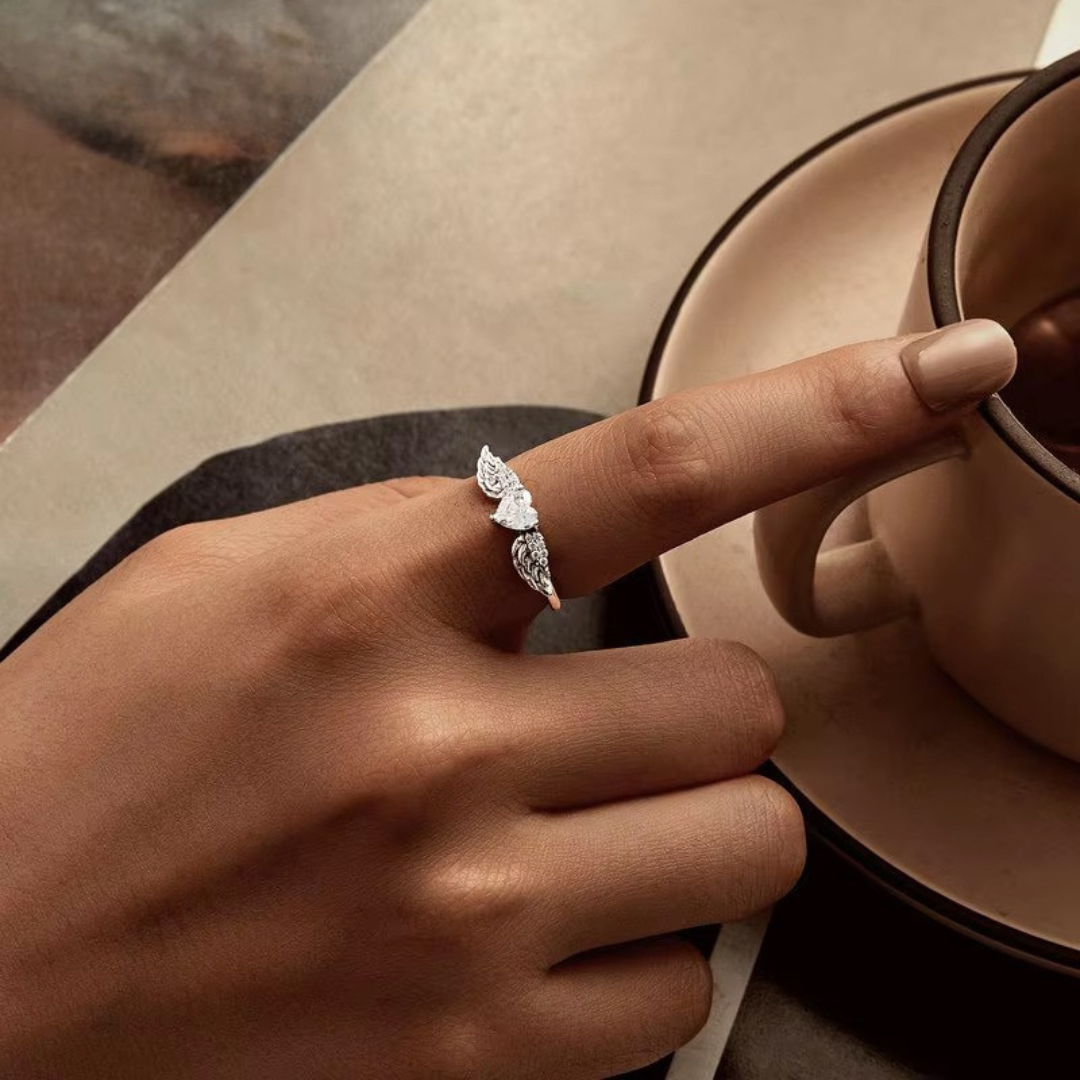 Este anel delicado traz um coração em zircônia branca centralizado entre duas asas de anjo detalhadas, simbolizando cuidado e elevação espiritual.