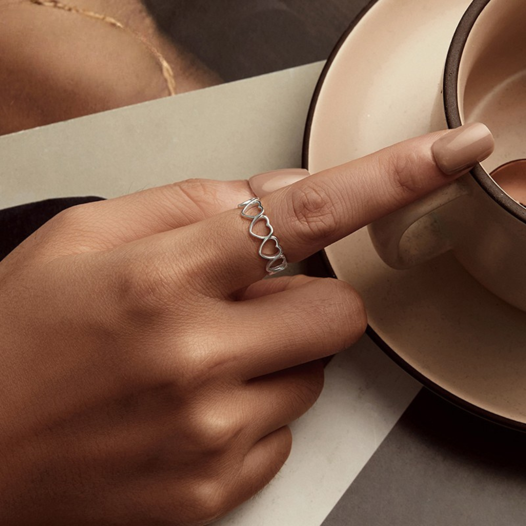 Um símbolo delicado de amor e conexão, este anel apresenta uma sequência de corações vazados em um design elegante e minimalista. Ideal para presentear quem se ama – ou para representar o amor-próprio de forma sutil.
