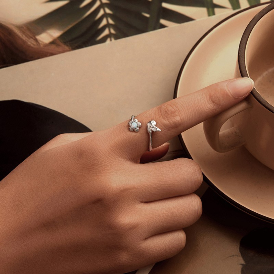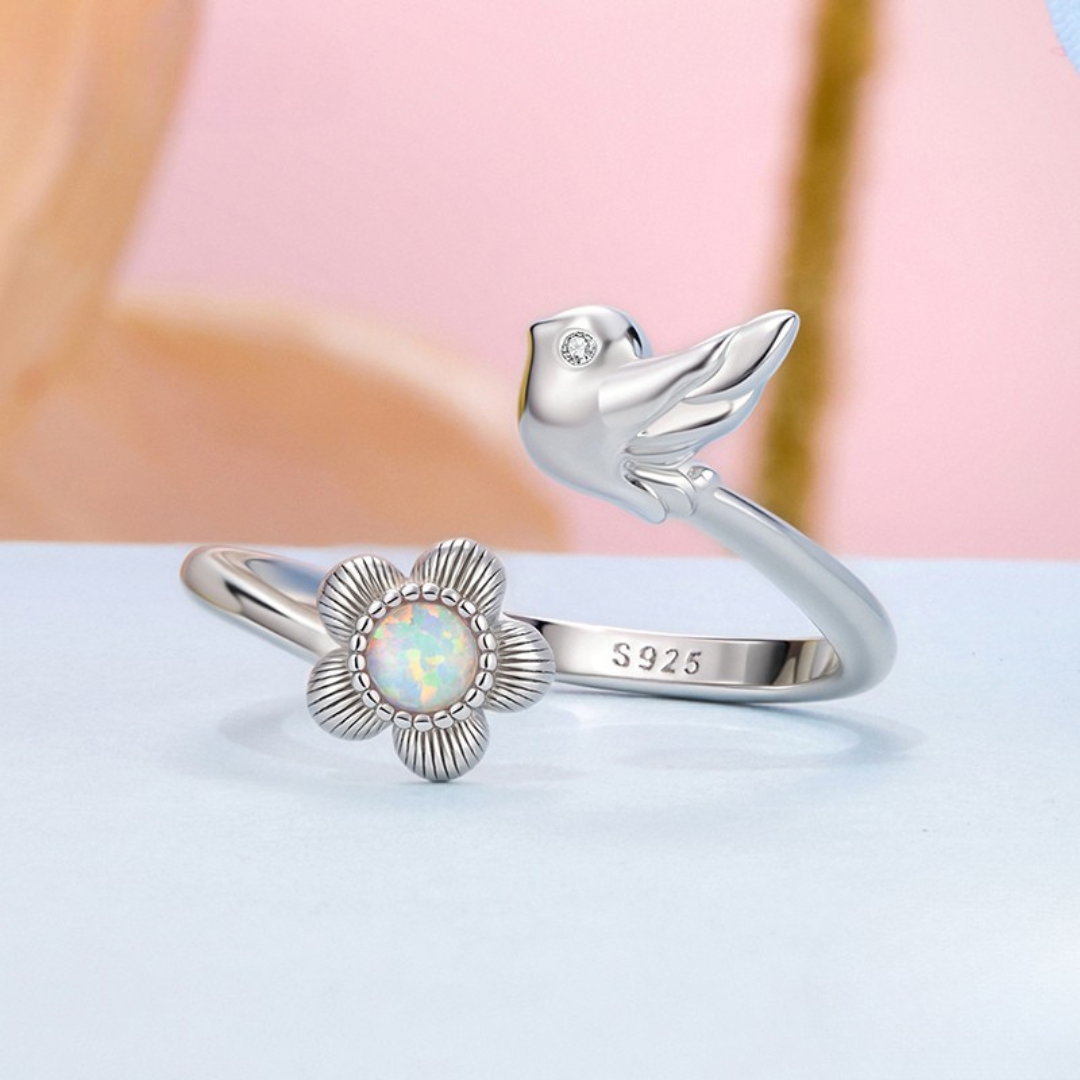 Uma joia que une delicadeza e significado. Este anel traz a imagem de um pequeno pássaro pousando delicadamente sobre uma flor com pedra central iridescente, remetendo à leveza da natureza e aos ciclos de renascimento. Uma peça única, simbólica e encantadora.