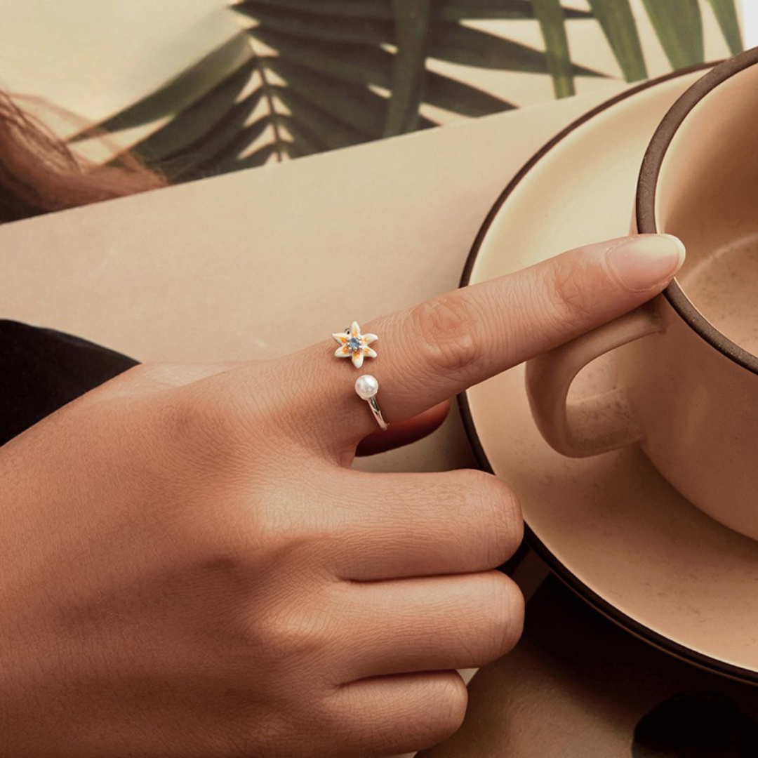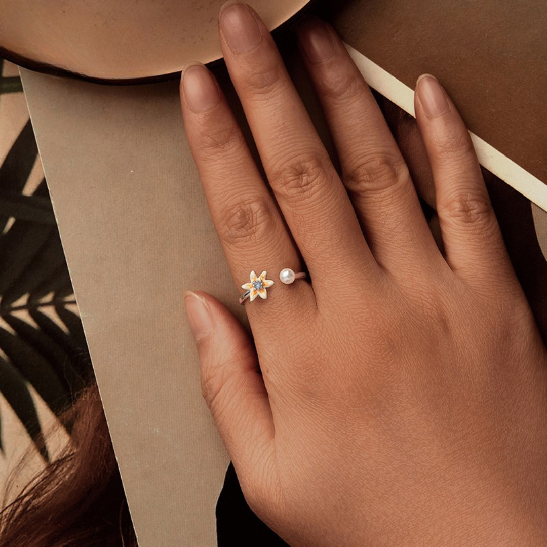 Inspirado na leveza da estação mais charmosa do ano, o anel ajustável Flor de Primavera em prata 925 traz um design floral delicado com acabamento esmaltado em tons suaves e uma elegante pérola na outra extremidade.