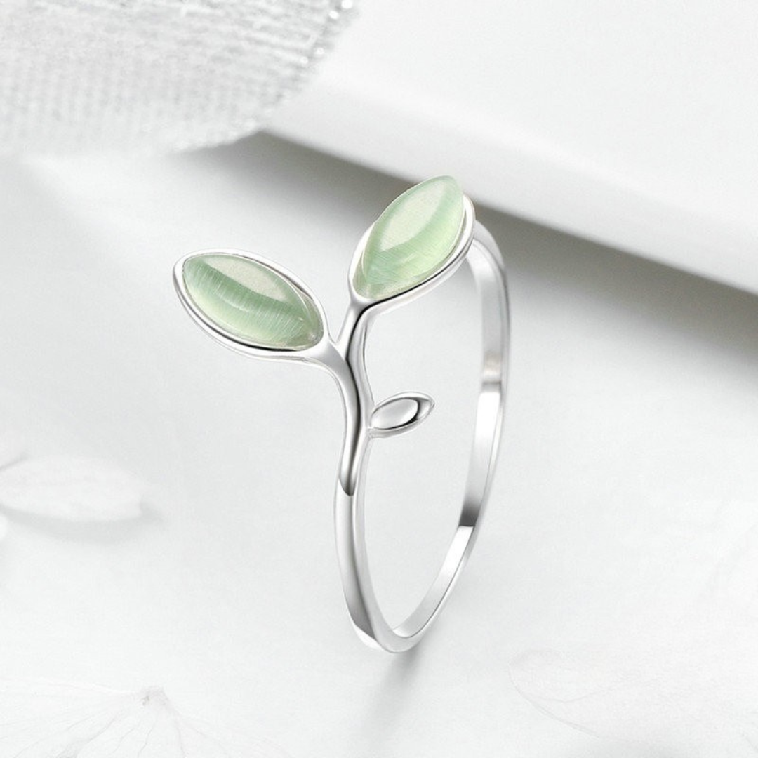 Anel delicado e refinado, confeccionado em prata 925 legítima, com design inspirado na natureza e detalhes de folhas cuidadosamente esculpidas com pedras verdes.