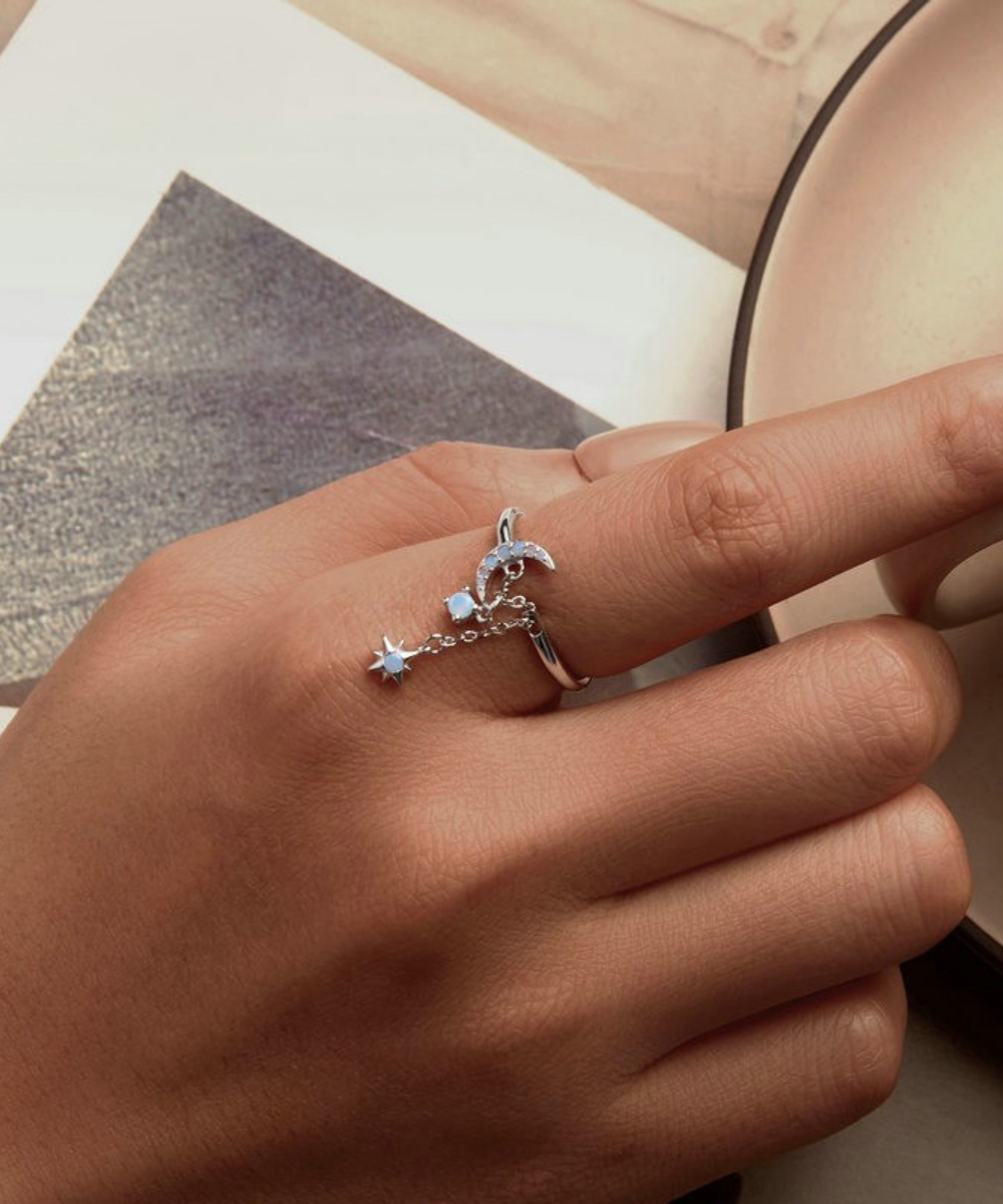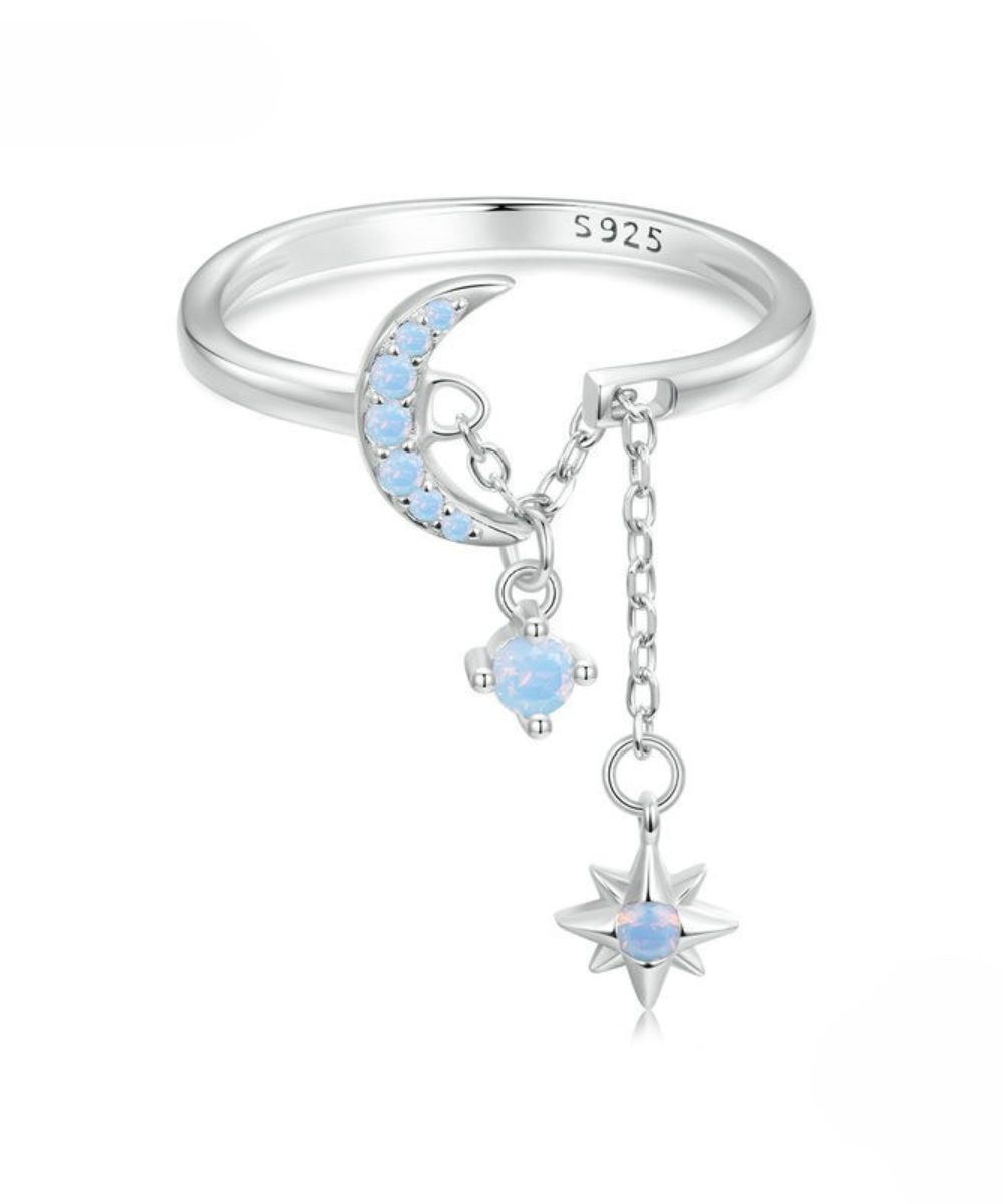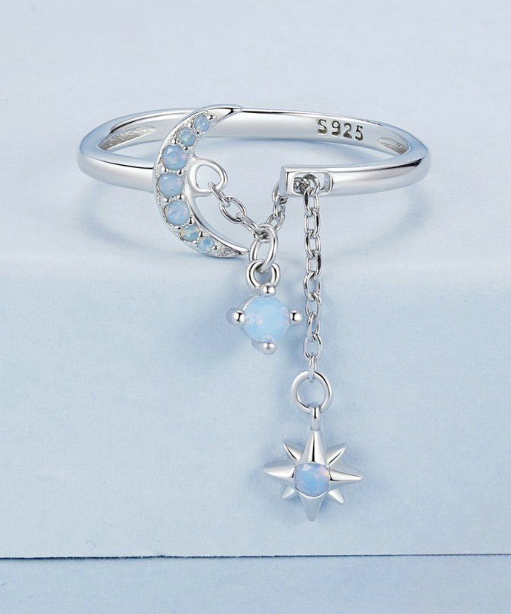 Este anel delicado e cheio de charme traz a beleza mística da lua e da estrela unidas por uma corrente suave, simbolizando sonhos, intuição e proteção. A pedra opala central reflete tons suaves e mágicos, evocando a luz da lua em noites serenas.