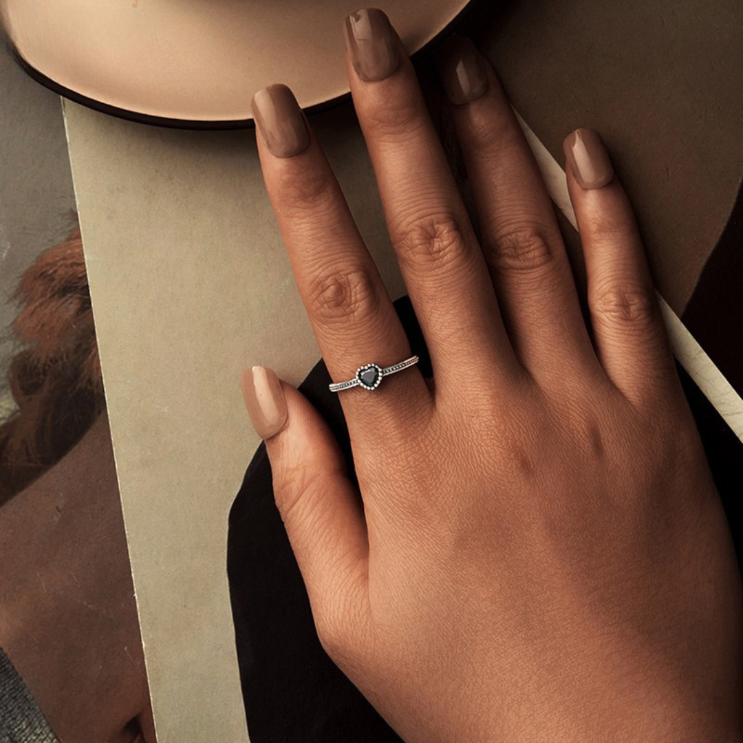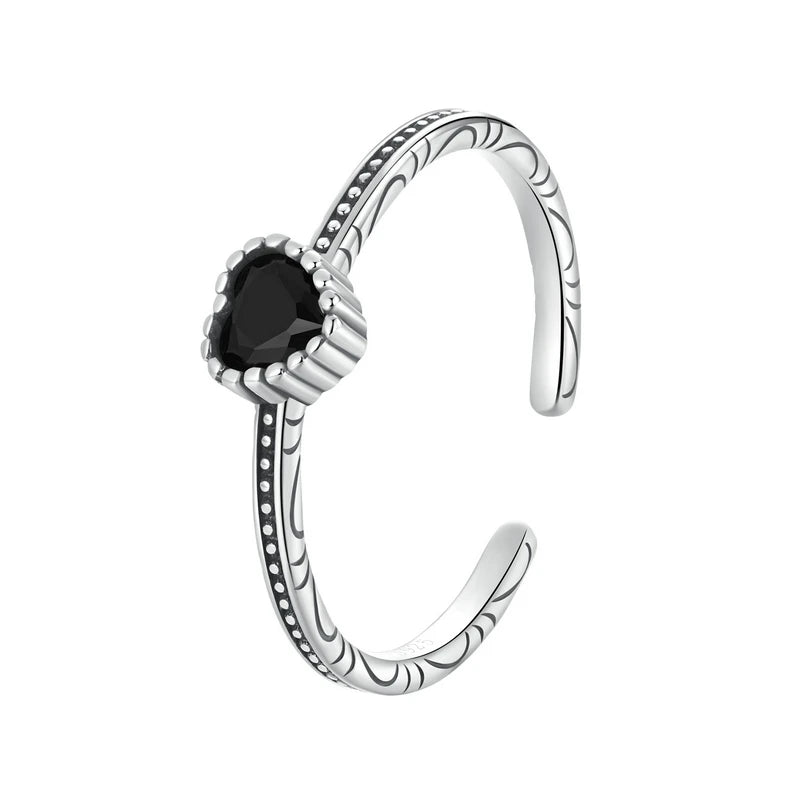 Um clássico moderno com toque ousado: este anel em Prata 925 traz um coração preto em zircônia no centro de um aro ajustável, com detalhes entalhados que criam um visual sofisticado e marcante.