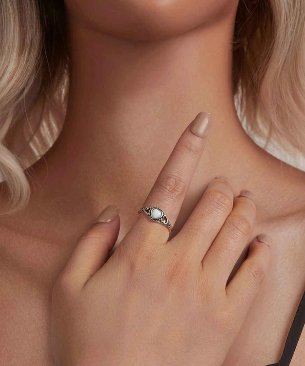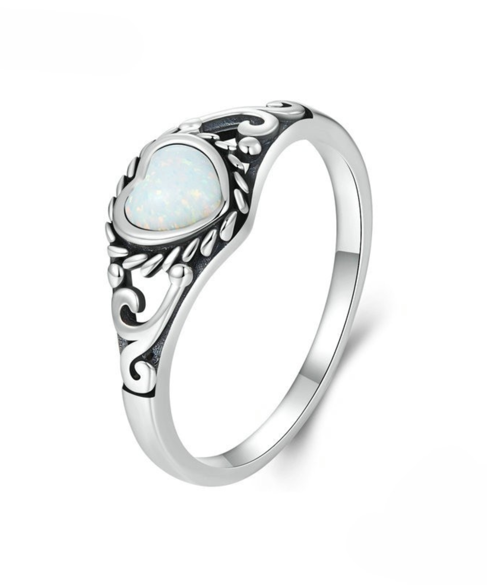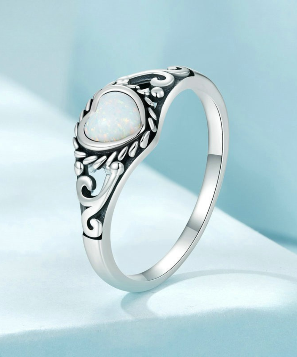 Anel em Prata 925 legítima, com pedra opala em formato de coração e detalhes esculpidos no aro, trazendo um toque vintage e artesanal. Ideal para mulheres que gostam de joias com significado e personalidade.
