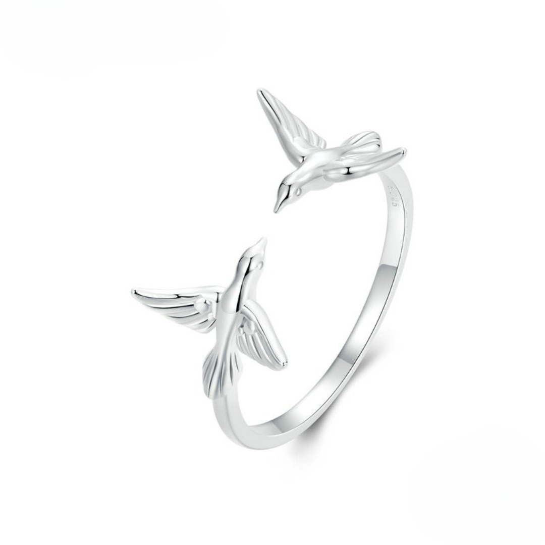 Anel aberto em Prata 925 legítima, com um design elegante e poético que apresenta duas aves em pleno voo, simbolizando liberdade, leveza e harmonia. Um acessório perfeito para mulheres que apreciam a natureza e desejam expressar sua personalidade com sofisticação.