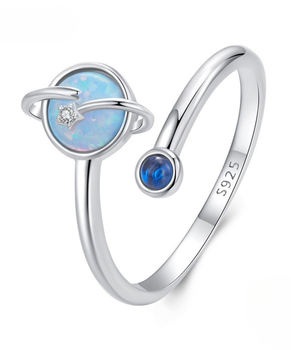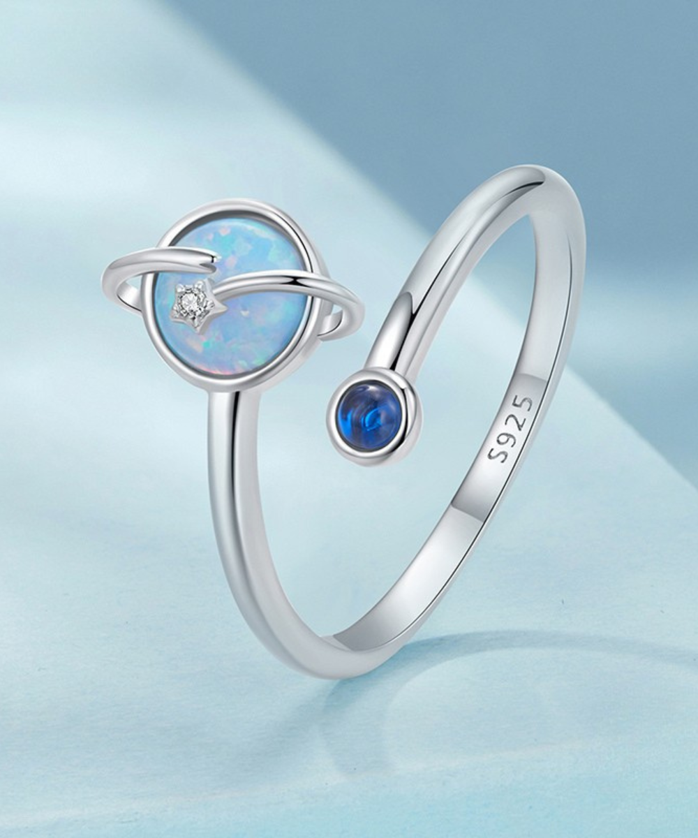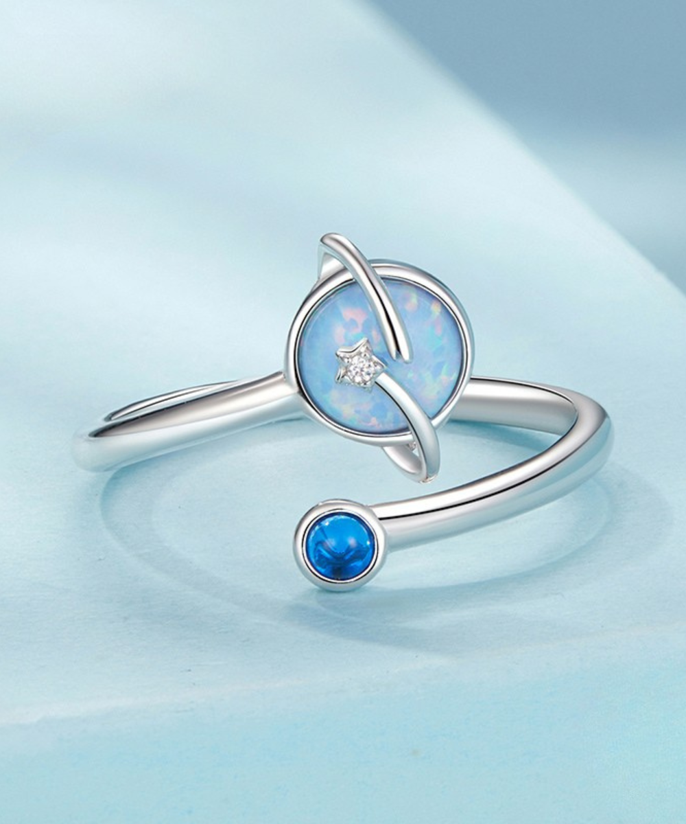 Inspirado na grandiosidade do cosmos, este anel traz a beleza de um planeta opalescente cercado por uma órbita brilhante, acompanhado de uma pedra azul profunda que remete às estrelas distantes. Uma peça moderna e delicada, perfeita para quem sonha alto e carrega o universo no coração.