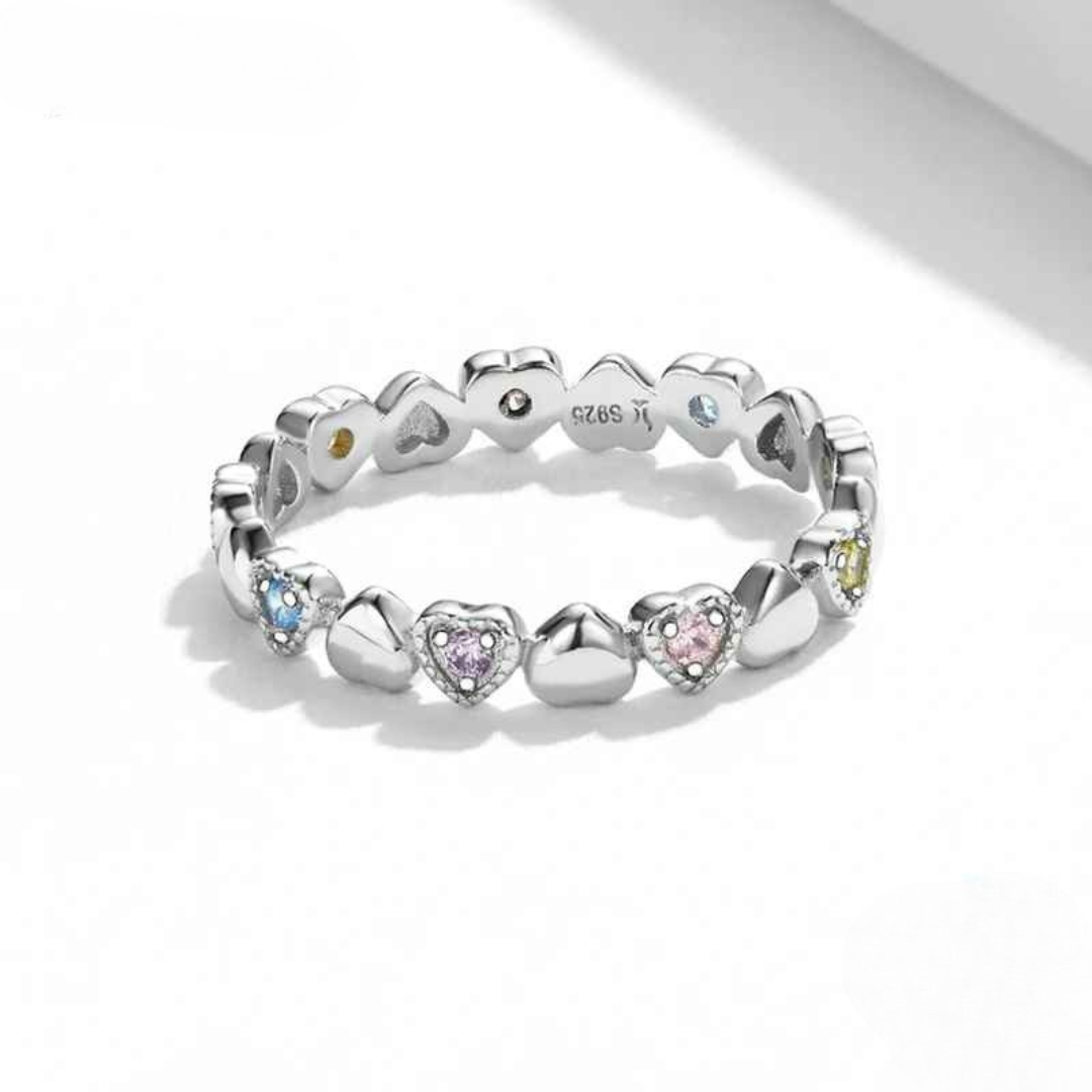 Um anel encantador e moderno, feito em Prata 925 legítima, com design de pequenos corações e cristais coloridos que criam um efeito arco-íris delicado e cheio de charme.