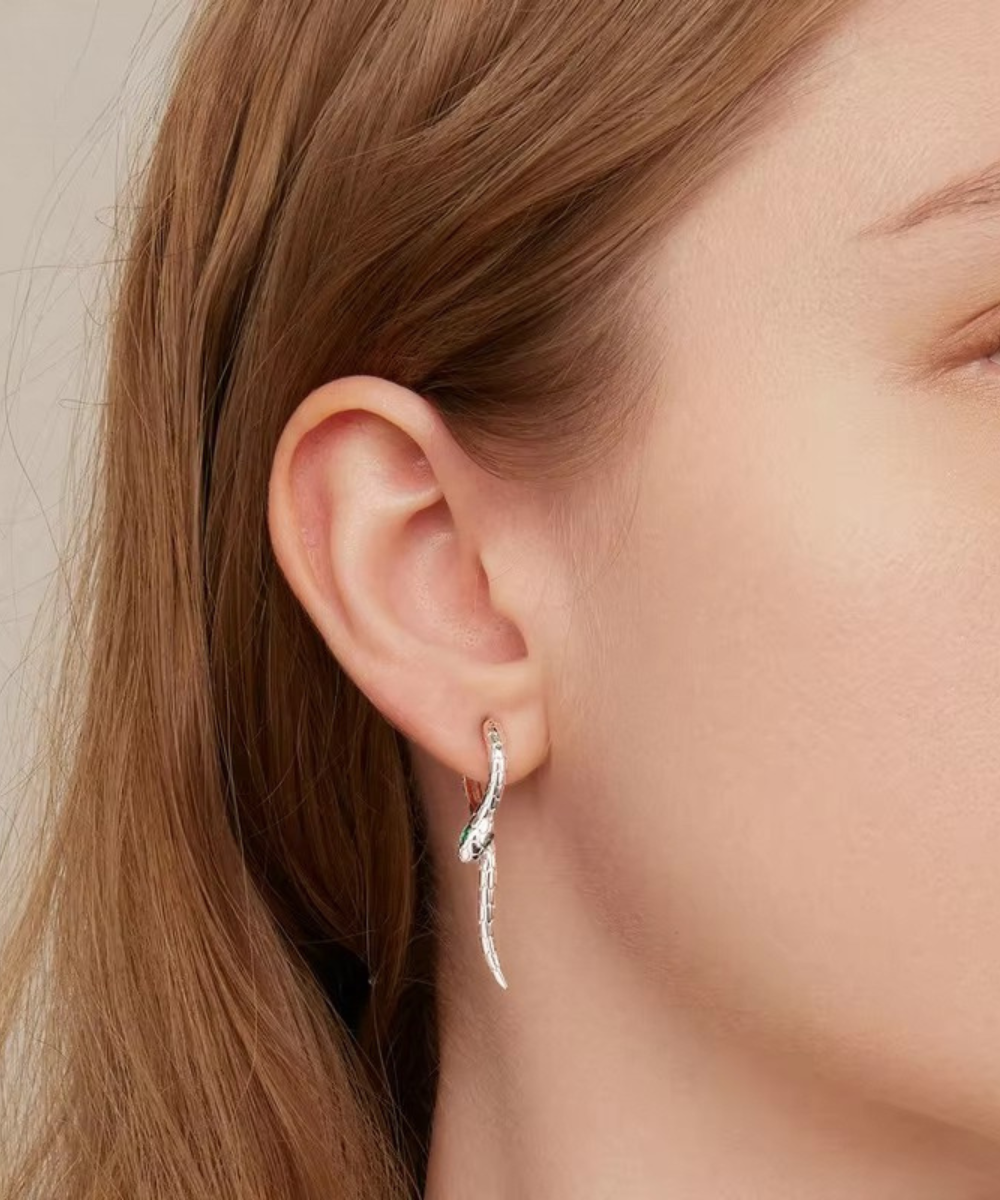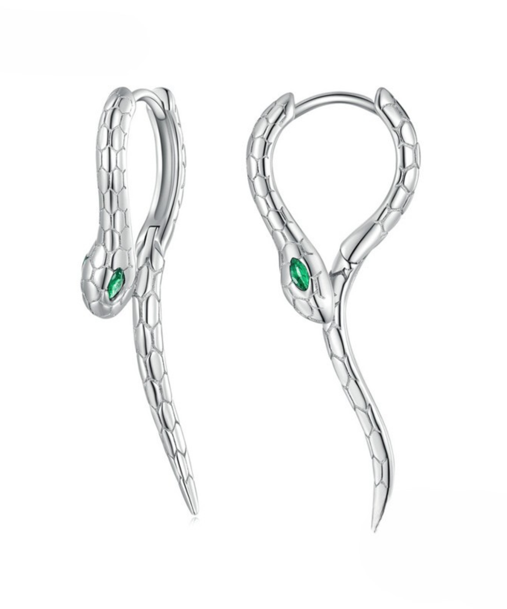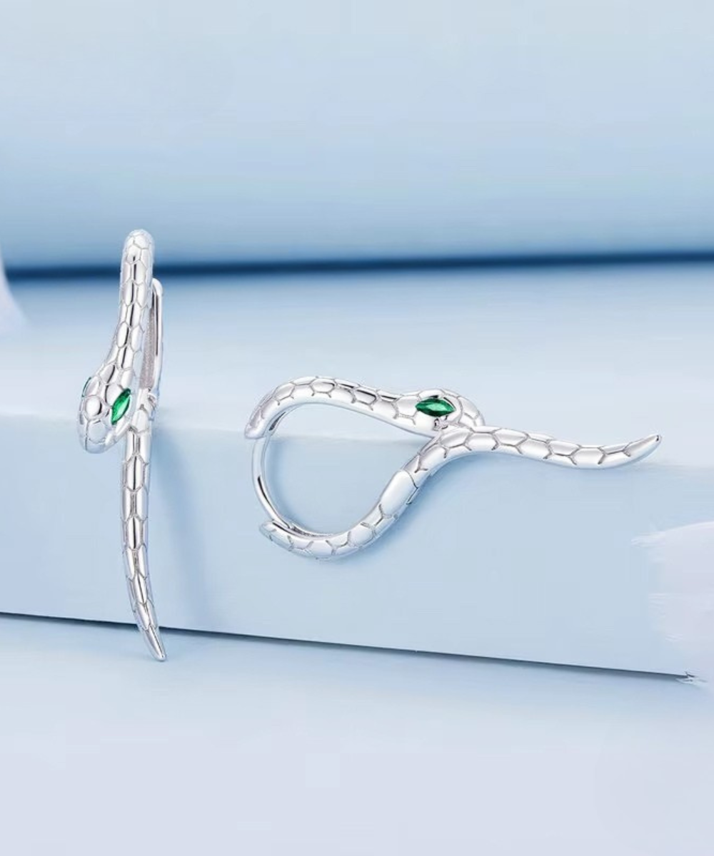 Brinco de argola em Prata 925 legítima, com design inspirado na forma sinuosa da cobra, símbolo de poder e transformação. Detalhes refinados e zircônia verde nos olhos trazem um toque elegante e marcante à peça, ideal para mulheres que apreciam acessórios únicos e cheios de personalidade.
