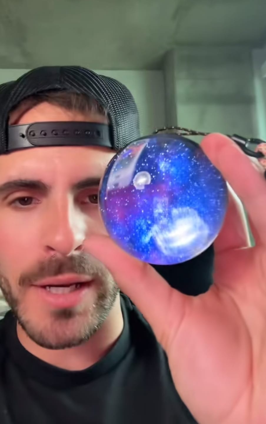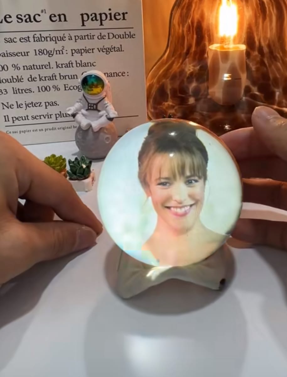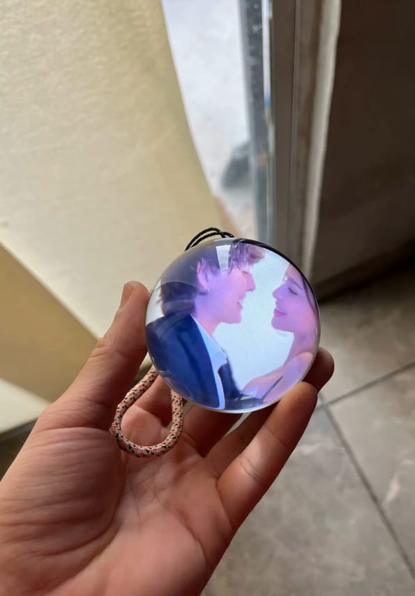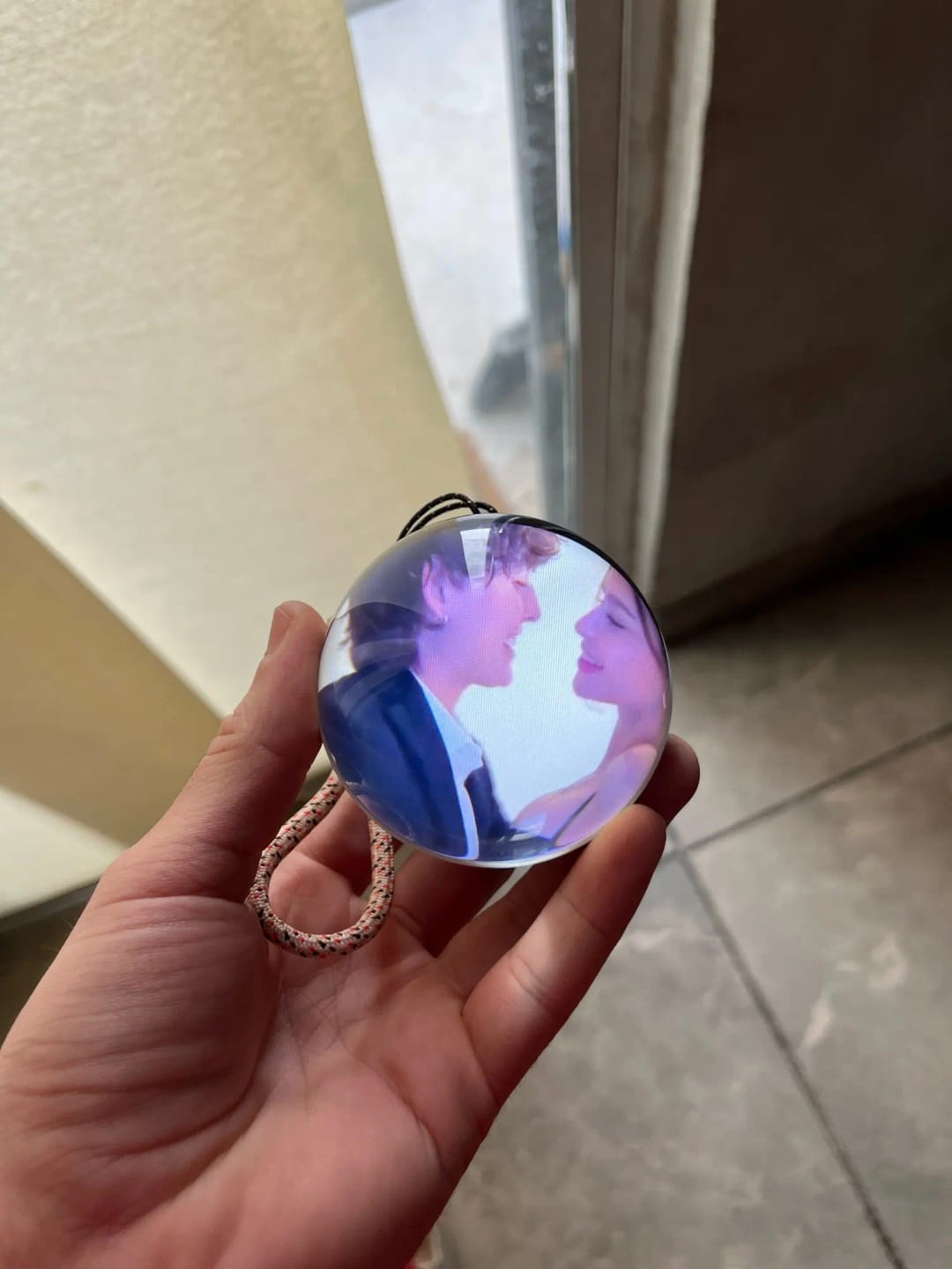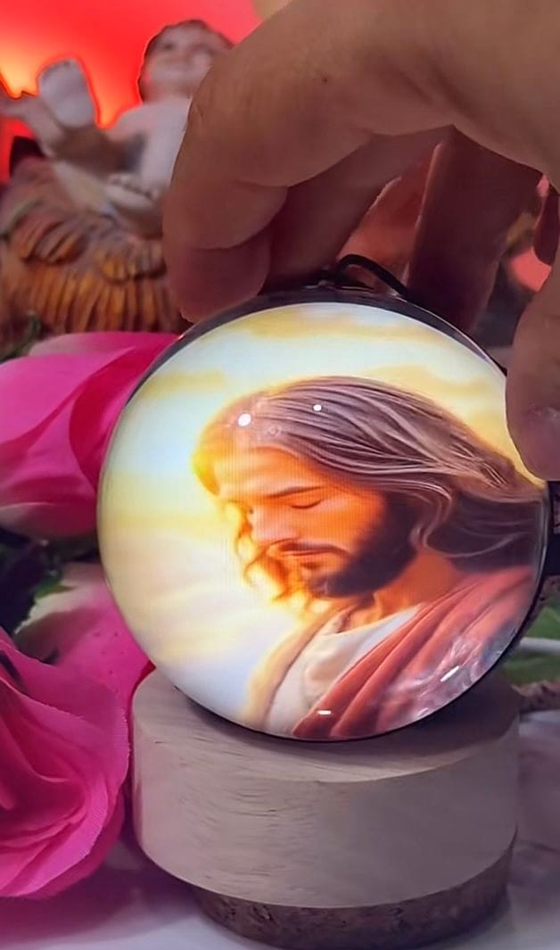 É uma esfera com tela embutida que guarda seus vídeos mais especiais. Basta conectar no computador via USB-C, carregar o arquivo e pronto: suas memórias ganham vida em segundos.