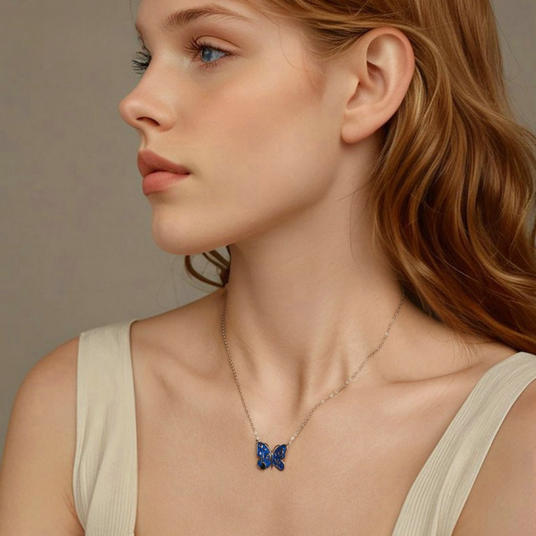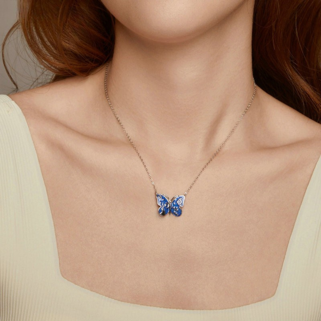 Delicado e expressivo, este colar em Prata 925 apresenta uma borboleta com acabamento esmaltado azul e detalhes dourados que lembram constelações. Uma peça única que representa transformação, liberdade e conexão com o universo.