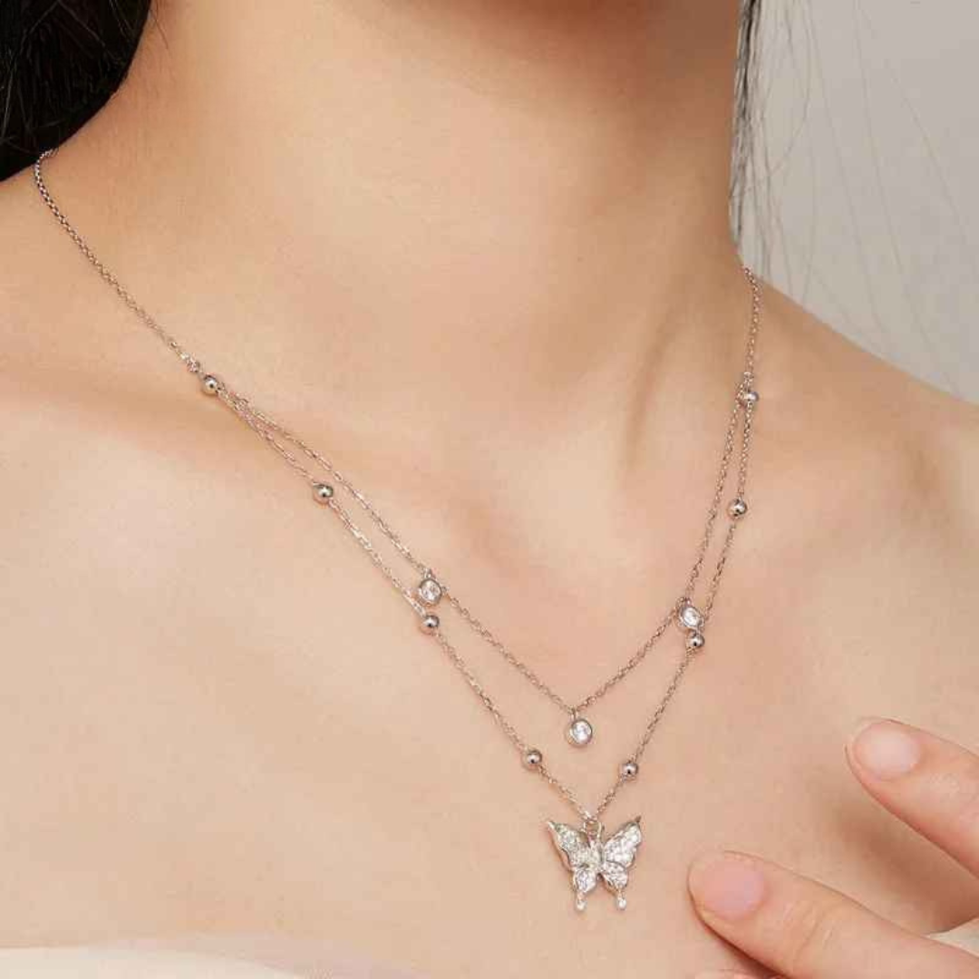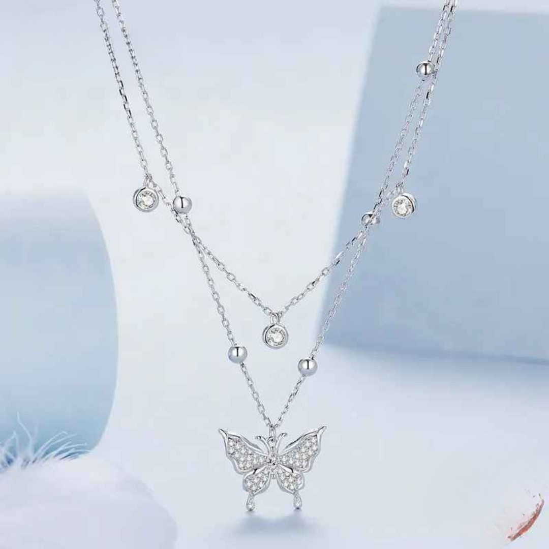 Feito em prata legítima 925, traz uma composição moderna com corrente dupla: a primeira com pequenos detalhes brilhantes e a segunda com um pingente de borboleta, símbolo de transformação e liberdade.