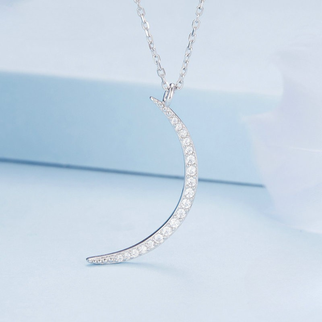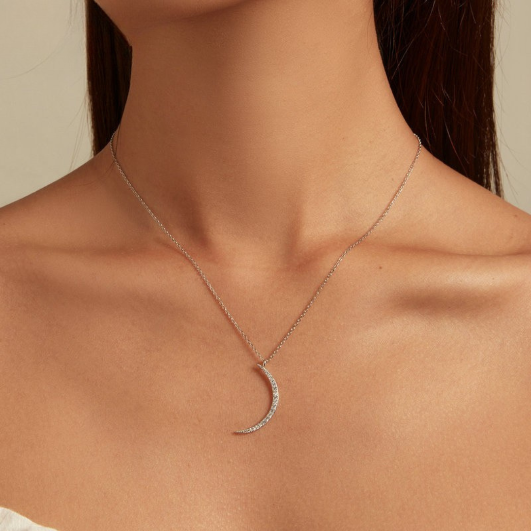 Com um design delicado e místico, este colar em formato de lua crescente é cravejado com zircônias cintilantes que refletem a luz com sutileza e charme. Um símbolo de intuição e renovação, perfeito para mulheres que amam peças com significado.