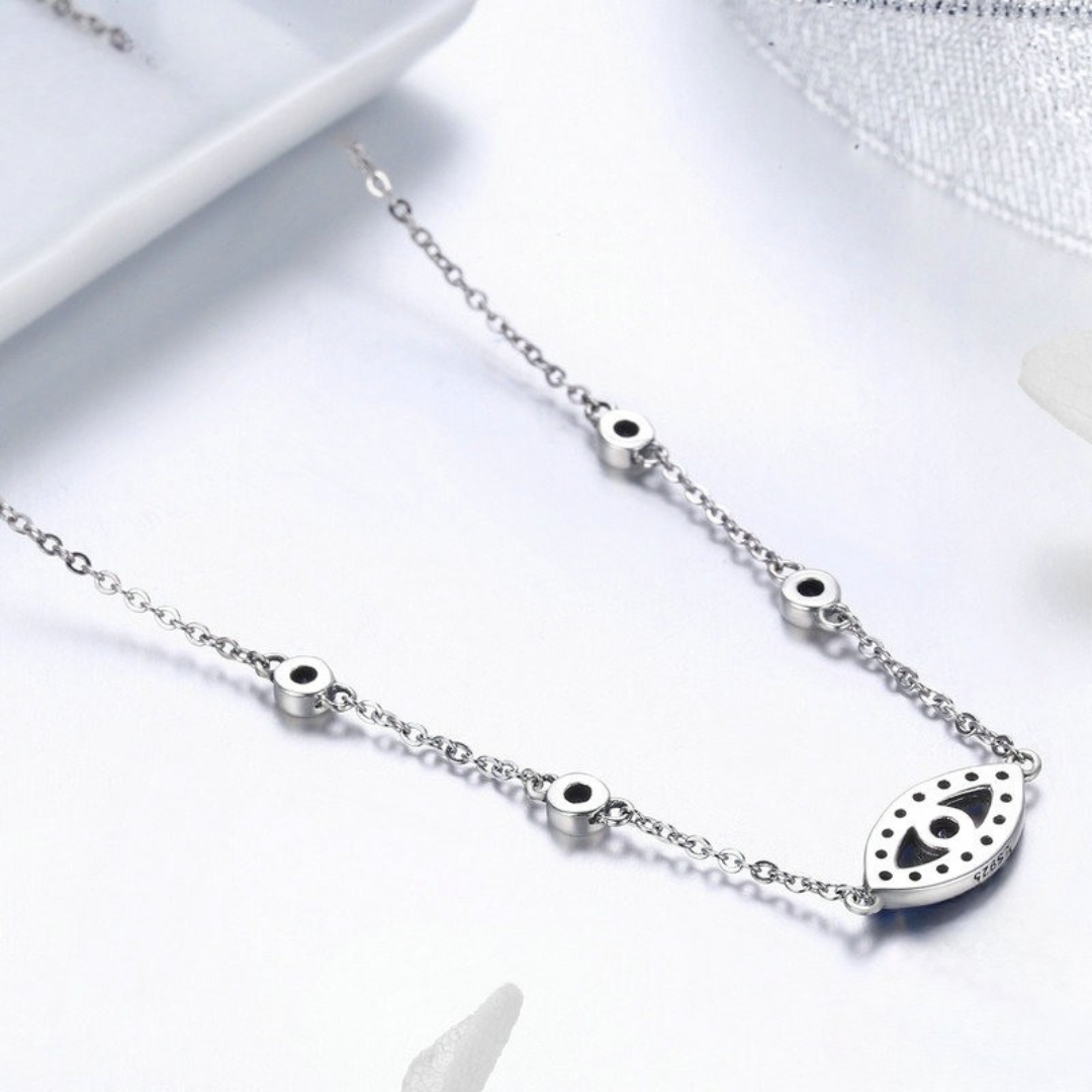 Um colar delicado e cheio de significado, com design moderno de olho grego em formato geométrico. A zircônia azul ao centro simboliza proteção contra energias negativas, trazendo charme e elegância à peça.