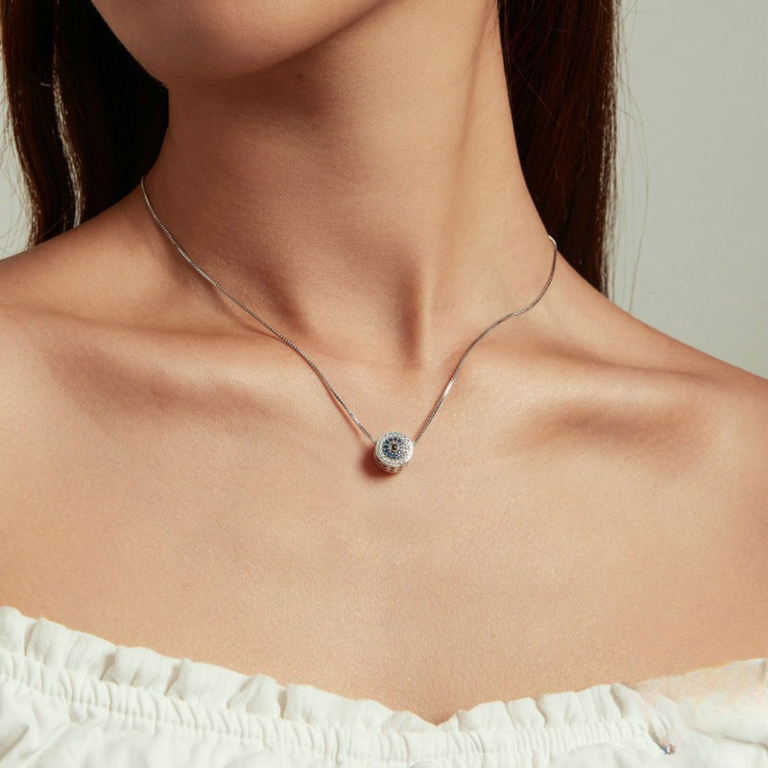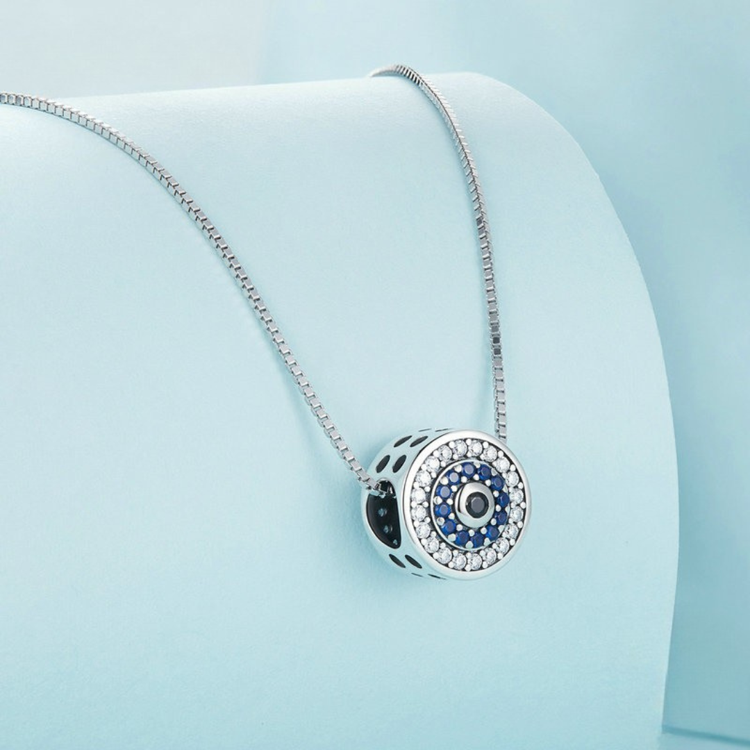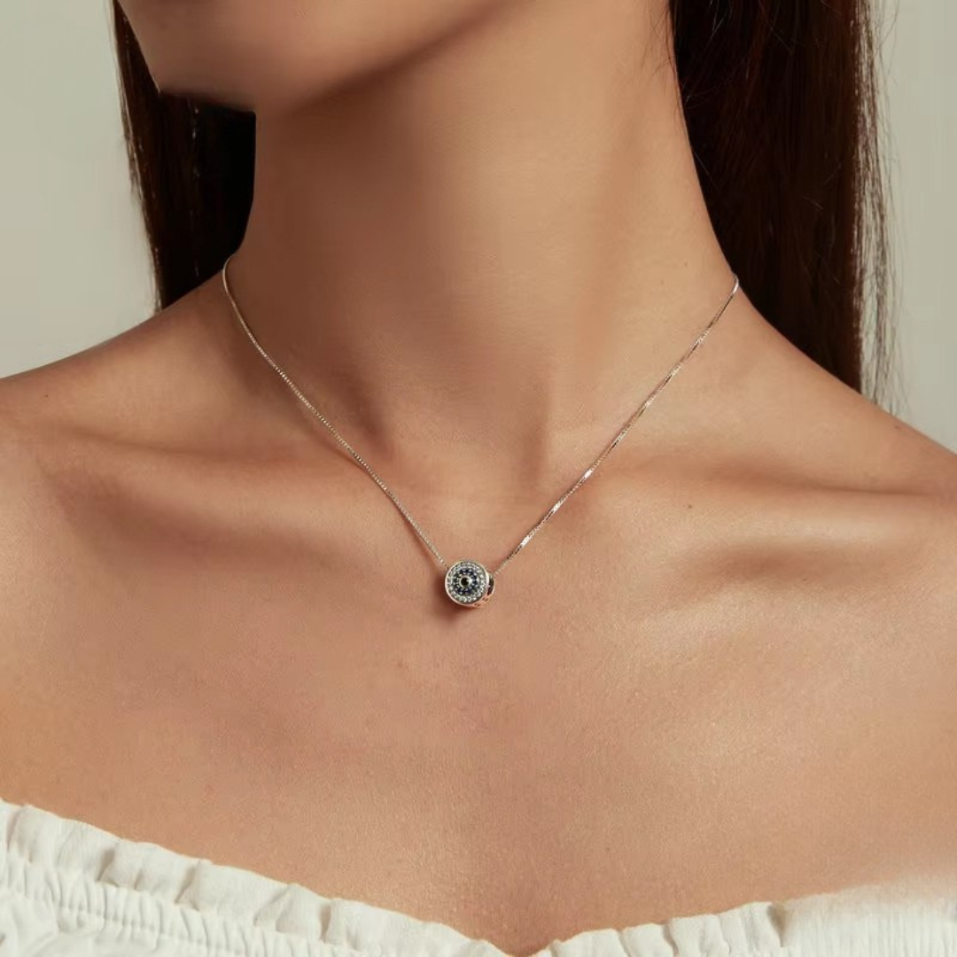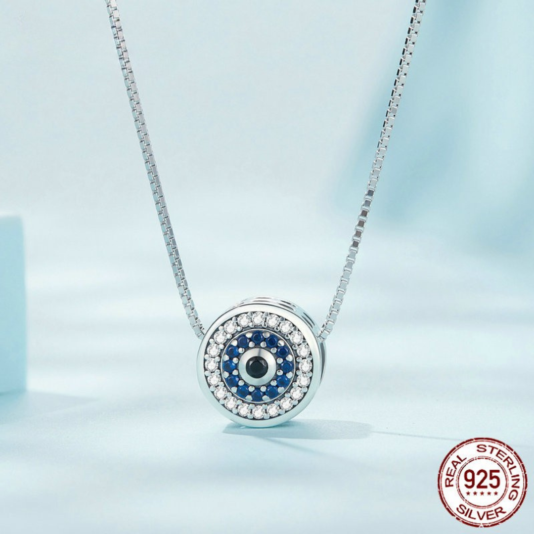 Com um design moderno e elegante, este colar apresenta o clássico símbolo do olho grego em formato redondo com cristais de zircônia azul, representando proteção e boas energias. É uma joia que combina espiritualidade e sofisticação.