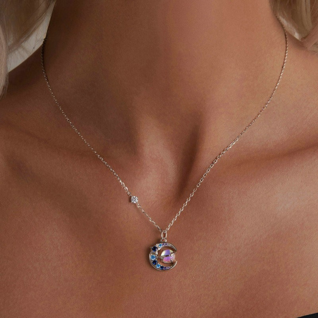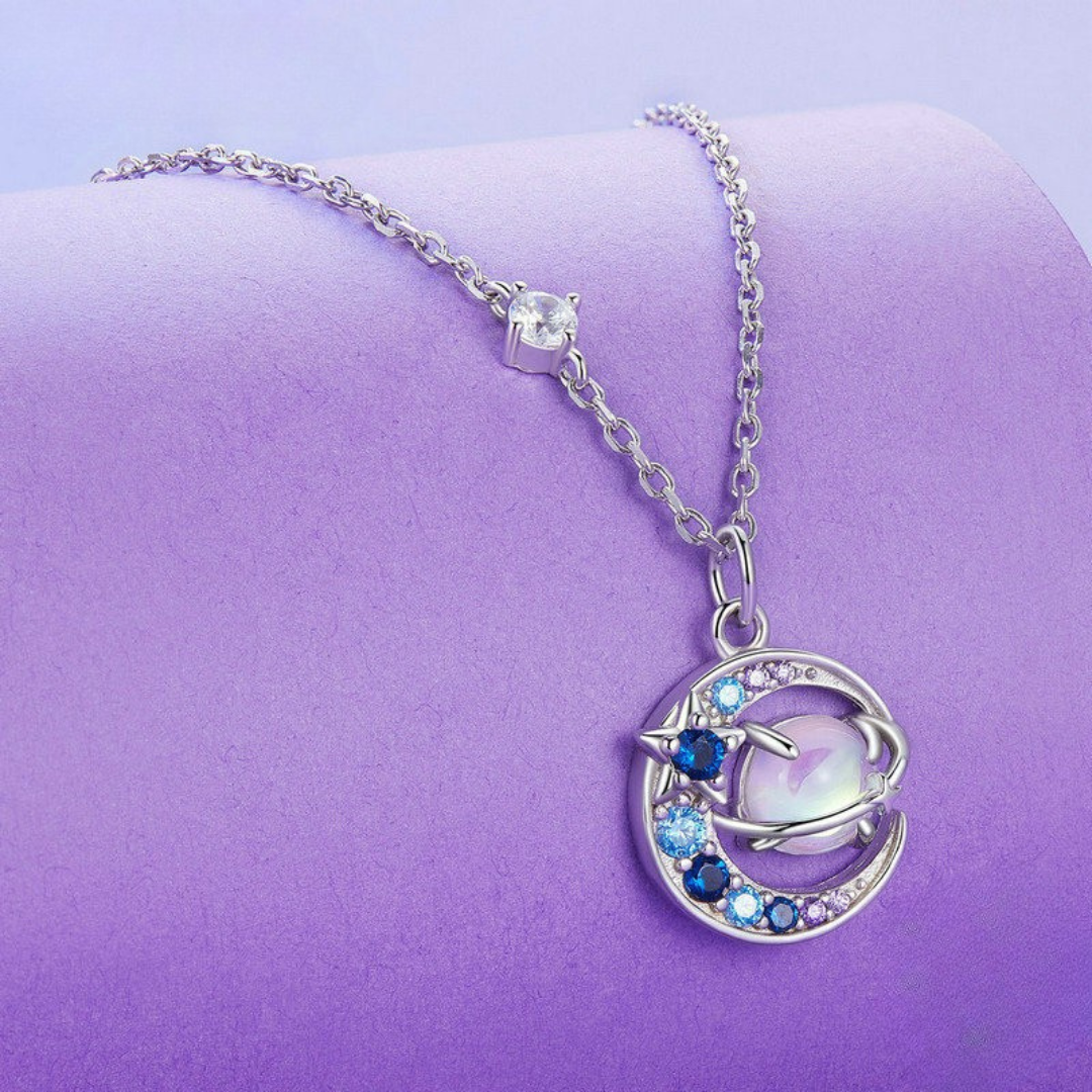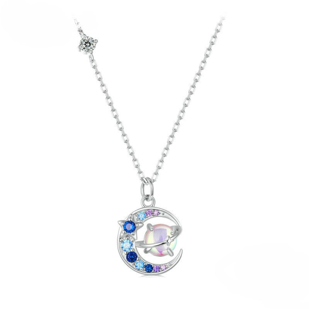 Para quem sonha alto e ama o brilho das estrelas, este colar em Prata 925 traz o universo pertinho de você. O pingente une lua, planetas e zircônias em tons de azul e lilás, criando uma joia moderna e cheia de charme.